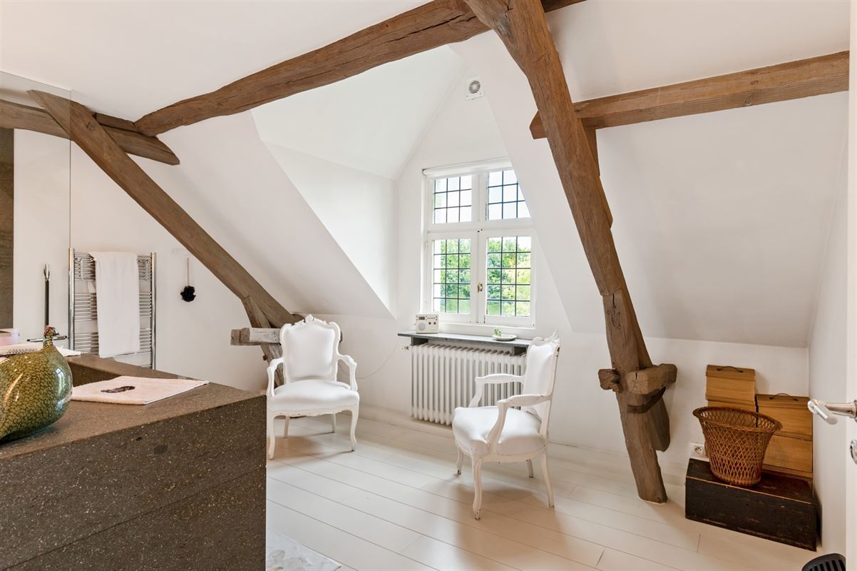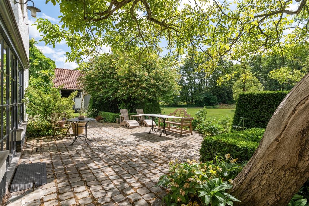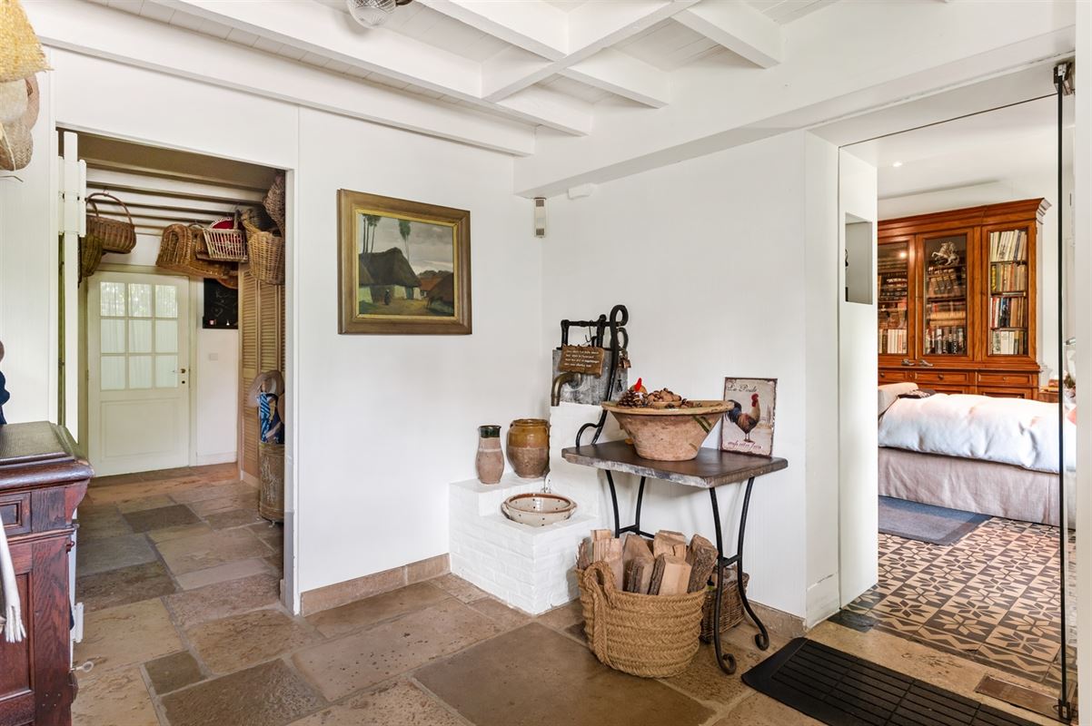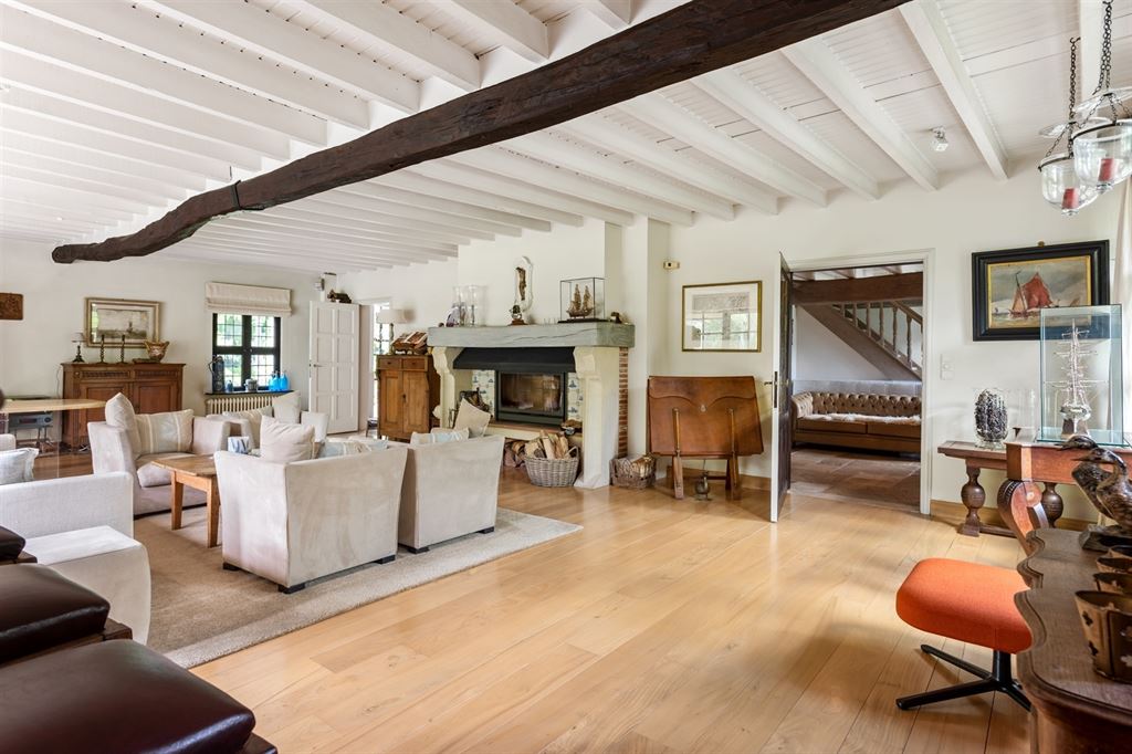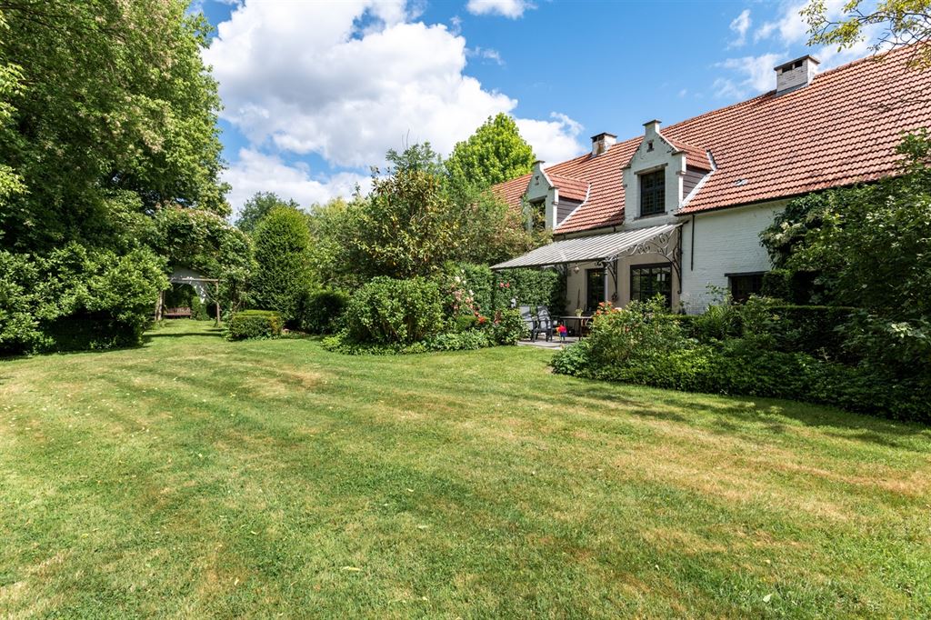 De woning straalt karakter uit dankzij een rijk palet aan authentieke elementen zoals de houten balkenstructuur, olmhouten parketvloeren, natuursteen en een gezellige kassettenopenhaard in de leefruimte. Op het gelijkvloers bevinden zich een ruime inkomhal met ingebouwde kasten, een lichtrijke leefruimte met zit- en eetgedeelte die directe toegang geeft tot het verharde terras met uitzicht op de fraai aangelegde tuin en het omliggende groen, een gastentoilet met lavabo, een volledig uitgeruste keuken met toegang tot het tweede terras, een bureauruimte en een douchekamer. De eerste verdieping omvat een royale master bedroom met ensuite badkamer, twee even grote slaapkamers, een moderne douchekamer en een apart toilet.