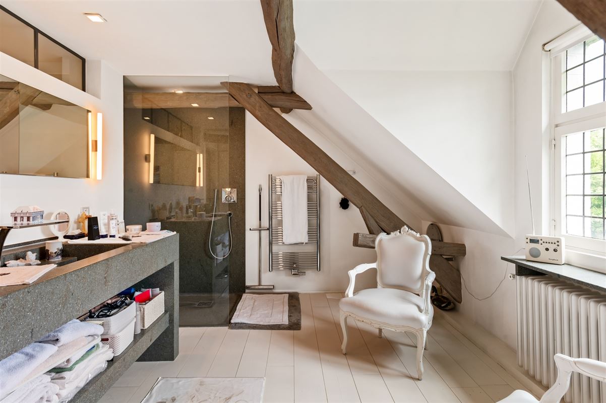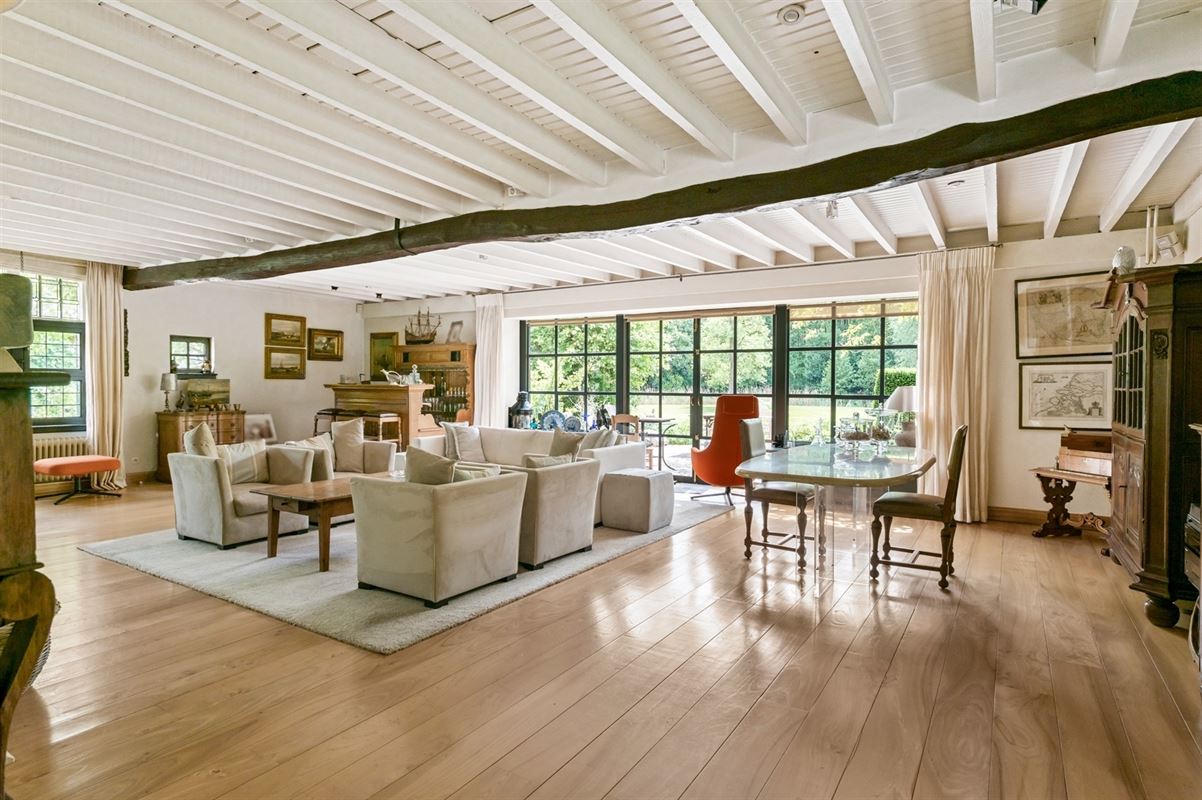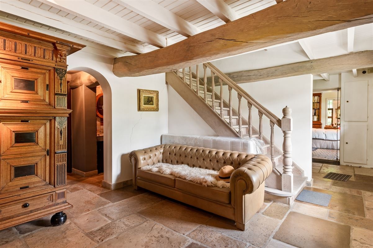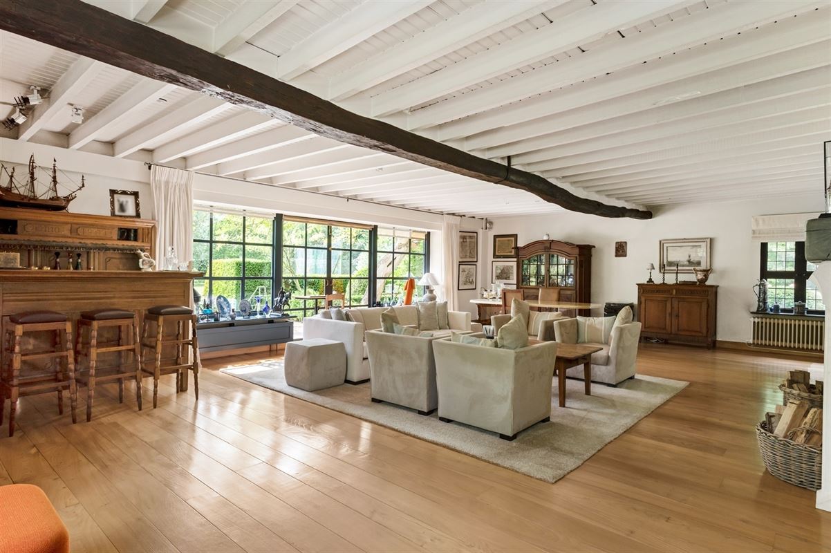 De woning straalt karakter uit dankzij een rijk palet aan authentieke elementen zoals de houten balkenstructuur, olmhouten parketvloeren, natuursteen en een gezellige kassettenopenhaard in de leefruimte. Op het gelijkvloers bevinden zich een ruime inkomhal met ingebouwde kasten, een lichtrijke leefruimte met zit- en eetgedeelte die directe toegang geeft tot het verharde terras met uitzicht op de fraai aangelegde tuin en het omliggende groen, een gastentoilet met lavabo, een volledig uitgeruste keuken met toegang tot het tweede terras, een bureauruimte en een douchekamer. De eerste verdieping omvat een royale master bedroom met ensuite badkamer, twee even grote slaapkamers, een moderne douchekamer en een apart toilet.