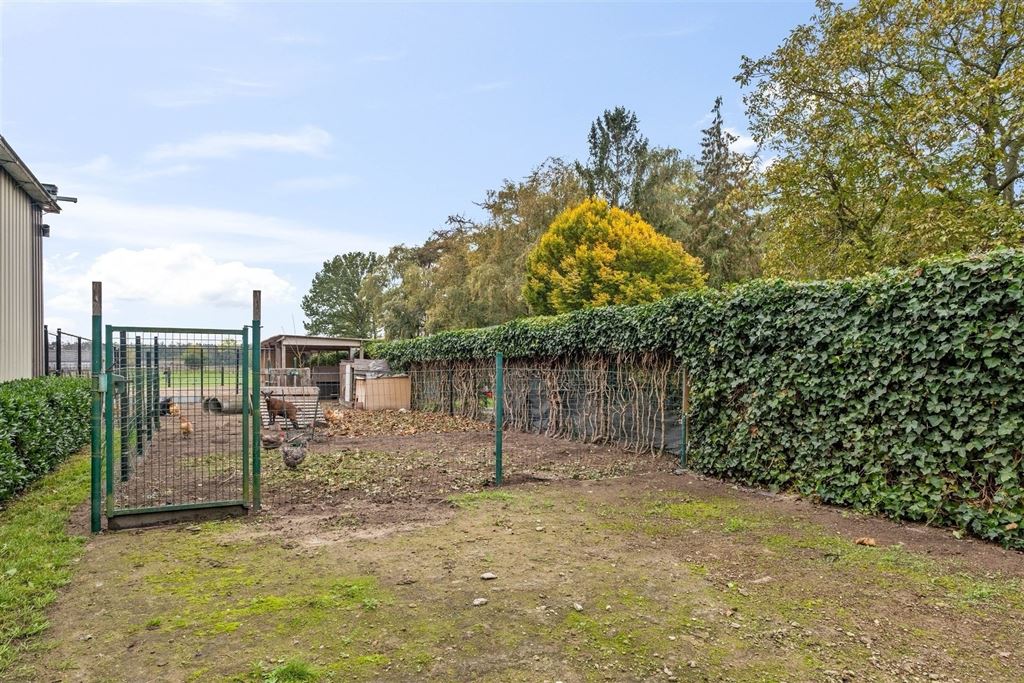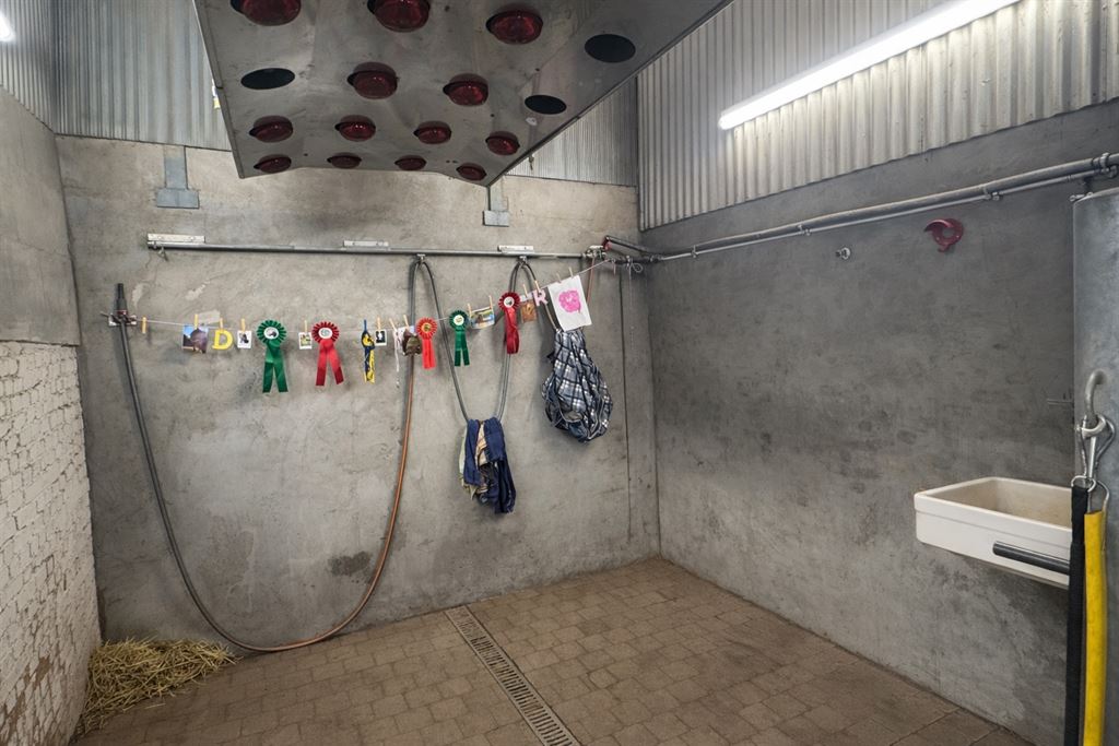 Achteraan is de inrit verhard met stelconplaten en het volledige domein is afgesloten met een automatisch bedienbare houten draaipoort. Verder is er een buitenpiste met beregening, meerdere schuilhokken en een volledig omheinde weide van maar liefst 8.650 m², wat zorgt voor optimale omstandigheden voor het houden van paarden aan huis.